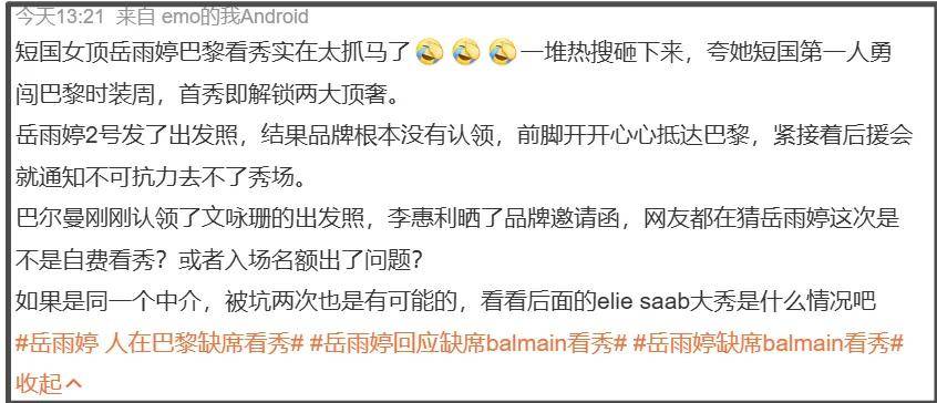 然后不出意外出意外了,岳雨婷喜提两条热搜,因为她人在巴黎缺席看秀。