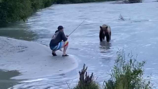 就在去年的这个时候,一位美国的钓友在大鱼上钩的时候碰到一只熊,他的同伴丢掉了鱼竿开始拍摄,只见这名钓友一动不动地拿着鱼竿,而熊则是试探性地靠近,然后迅速和人拉开距离,持续了两次,估计它觉得还算安全,第三次靠近的时候把钓友的鱼给抢走了。