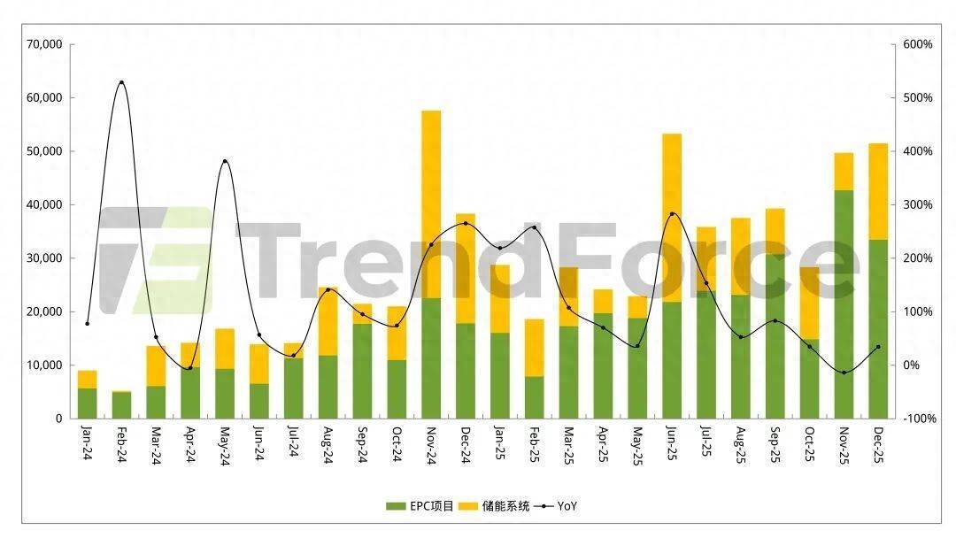 TrendForce集邦咨询数据显示,2025年12月国内储能新增中标量17.33GW/47.39GWh,同比分别增长111%、90%,环比激增126%、112%,其中,EPC中标规模创历史新高。